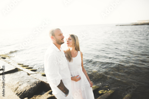 happy just married young wedding couple celebrating and have fun at beautiful beach sunset
