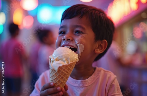 Happy kid with black hair eating ice cream cone. Cheerful boy enjoys delicious snack. Child eats ice cream, makes joyful funny face. Positive emotions, eating outdoors.