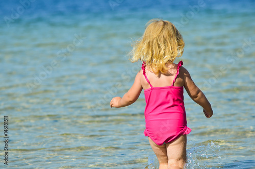Happy little blonde girl running in the water. Happy holidays concept.