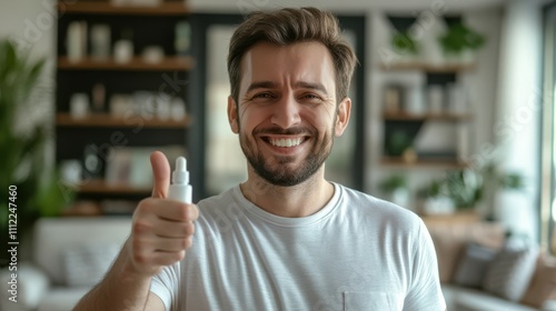 Happy man holding throat spray giving thumbs up in cozy home environment showing relief and satisfaction
