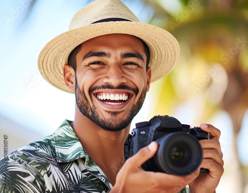 man, happy, smiling, camera, photo, tropical, shirt, palm, tree, hat, summer, vacation, travel, outdoors, joy, cheerful, bright, sun, fun, leisure, freedom, adventure, relaxed, content, photographer, image, picture, portrait, photogenic, beard, teeth, expression, lifestyle, holiday, escape, paradise, relaxation, happiness, positive, scenic, background, sharpened, closeup