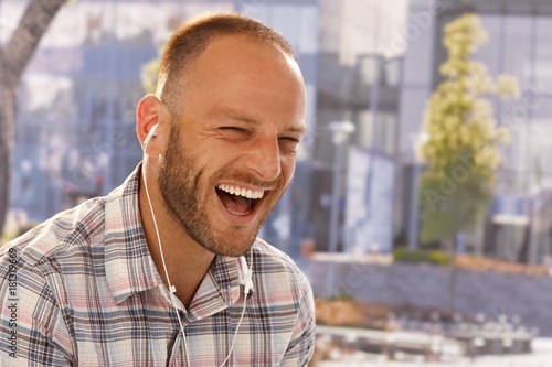 Happy man laughing with earbuds