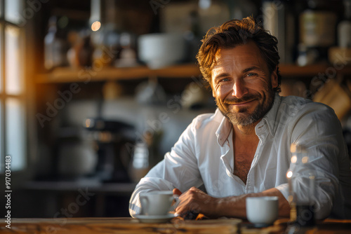 Happy man smiles contentedly while savoring a hot cup of coffee made by his wife, surrounded by a warm, inviting kitchen atmosphere at home during a sunny morning