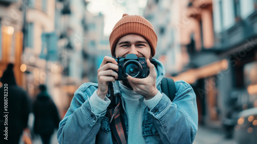 man, camera, photo, street, urban, outdoors, happy, smile, young, male, photographer, city, candid, casual attire, digital, lifestyle, capturing, modern, hobby, passion, travel, adventure, artistic, joyful, energetic, vibrant, fun, creative, trendy, confident, culture, expression, snapshot, portrait, social, exploration, visual arts, stylish, winter, urban life