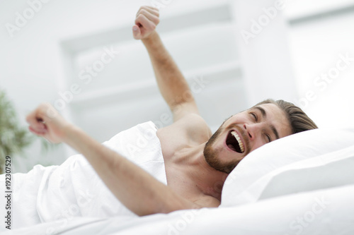 happy man waking up in a comfortable room