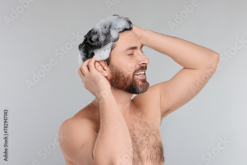 Happy man washing his hair with shampoo on grey background