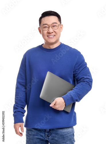 Happy man with laptop on white background