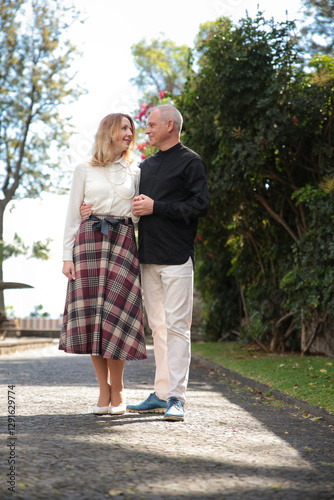 Happy mature couple walking in beautiful garden, enjoying romantic stroll