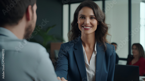Happy Mid-Aged Business Woman Manager Handshaking at Office Meeting - Job Interview and Contract Deal