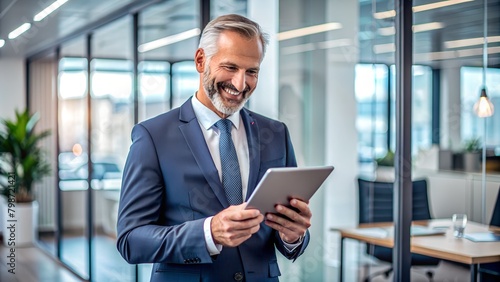 Happy middle aged business man ceo wearing suit standing in office using digital tablet.
