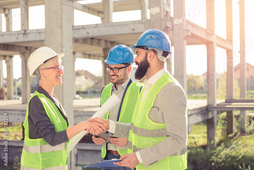 engineer, building contractor, construction site, architect, advice, meeting, handshake, leadership, organisation, civil engineering, hard hat, concrete, expertise, success, planning, teamwork, architecture, discussion, construction worker, built structure, design, construction industry, technician, business meeting, cooperation, adults only, brainstorming, colleague, housing project, strategy, technology, professional occupation, woman, man, equipment, prefabricated building, smiling, backlit, safety equipment