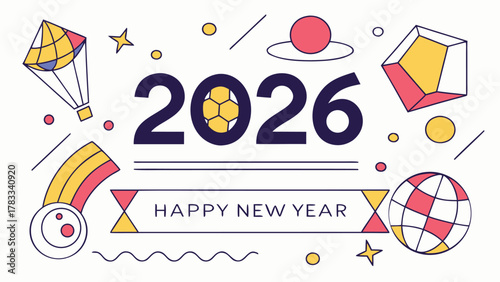 2026, new year, happy new year, celebration, greeting, modern, geometric, abstract, vector, illustration, design, future, calendar, date, season, holiday, festive, event, jan, football, football, sport, sphere, cone, polygon, shape, line, dot, colourful, bright, graphic, element, banner, message, digital, web, art, minimalist, typography, anniversary