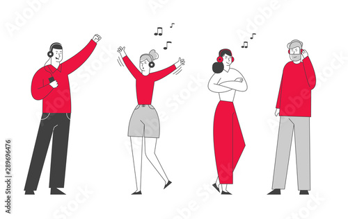 Happy People Clubbing and Dancing Disco at Night Club Party. Men and Women Characters Wearing Headset Listening Music and Dance at Nightclub. Nightlife Event Cartoon Flat Vector Illustration, Line Art