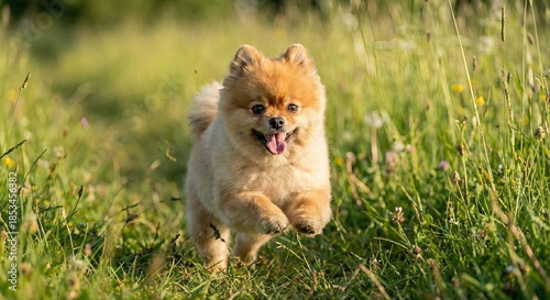 dog, puppy, pet, animal, pomeranian, running, jumping, playing, happy, joyful, energetic, active, cute, adorable, fluffy, small, brown, furry, smiling, outdoors, nature, meadow, field, grass, green, wildflower, summer, spring, sunshine, golden hour, sunlight, warmth, freedom, playful, canino, domesticated, healthy, motion, bokeh, sunny day, fun, sweet, tiny, rural, countryside