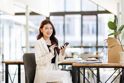 Happy positive smiling Asian Japanese office business woman Chinese Korean female businesswoman girl looking mobile phone screen dating online app chat dreaming receive good news inside
