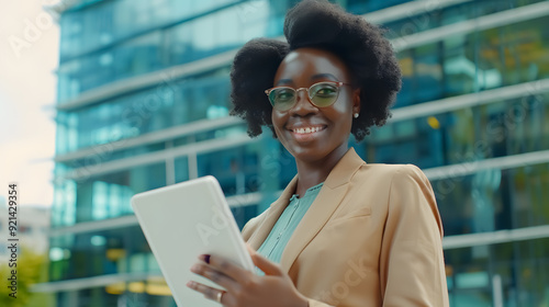 Happy professional using a tablet near an office building. Young African American business