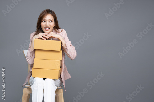 Happy smiling Asian woman holding package parcel box and sitting on white chair isolated on grey background, Delivery shipping and online shopping express concept