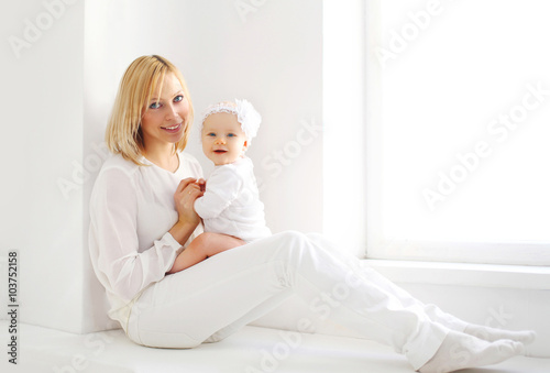 Happy smiling mother and baby at home in white room near window