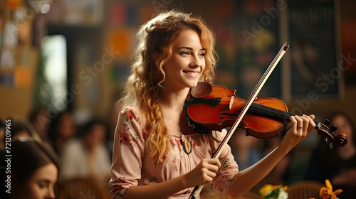 Happy smiling teenage girl playing violin in classroom at school background. Music school, additional creative classes, additional education course for children, Generative AI