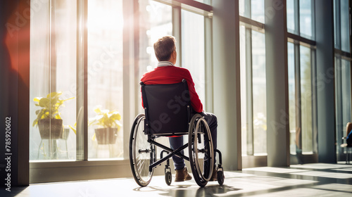 Happy, smiling young guy student in a wheelchair in the foyer of an educational institution.