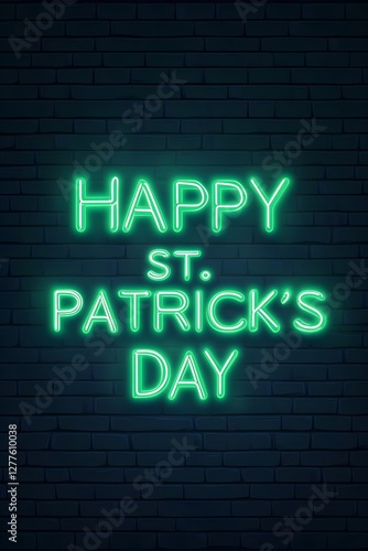 Happy St Patrick's day neon glowing text on dark brick wall background. Green luminous festive sign for irish holiday celebration. Modern night party decoration