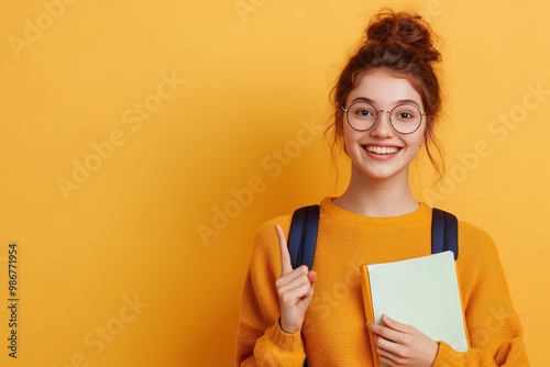 innocence, interaction, positivity, excitement, academic, library, pointing, book, cognition, motivation, inspiration, study, friendly, learning, presentation, youth, student, vibrant, creativity, school, goggles, joy, personality, expression, education, enthusiasm, smiling, happiness, well-being, communication, female, portrait, modern, notebook, empowerment, backpack, leisure, lifestyle, cheerful, fashion, casual attire, yellow background, youth culture, culture, casual clothes, warm colors