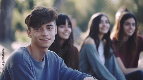 Happy teenagers, young people outdoors in leisure time, boy and group of girls, friends and friendships, spending time together, fictional place