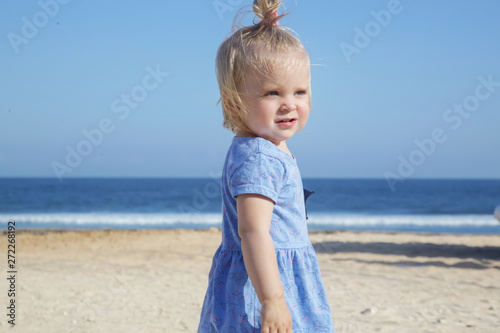Happy toddler girl in a blue dress enjoying a day at the beach