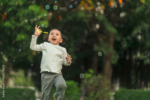 happy toddler girl running and playing soap bubble in park