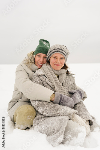 happy, woman, embracing, sitting, snow, winter, 2, happiness, smiling, copy space, people, travel, adult, journey, outdoors, day, leisure, friendship, friends, weather, woolly, hat, cap, cold, mid, pair, season, togetherness, caucasian, vacation, bonding, lifestyle, nature, clothes, warm, clothing, white, colours, female