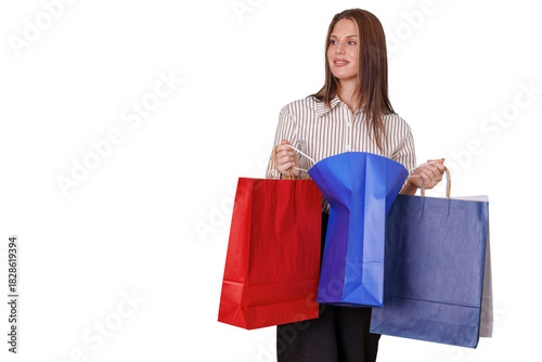 Happy woman holding multiple colorful shopping bags, enjoying consumerism and sales, studio shot with transparent background