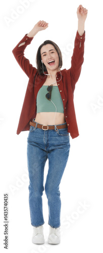 Happy woman in earphones dancing on white background