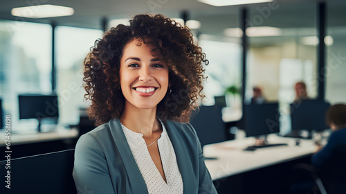 Happy woman with curly hair working in an office