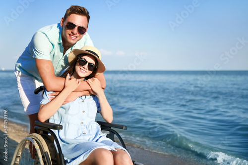 Happy woman with physical disability and her boyfriend at sea resort