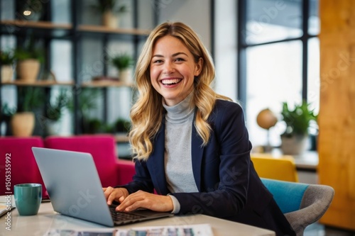 Happy woman works on laptop in modern office