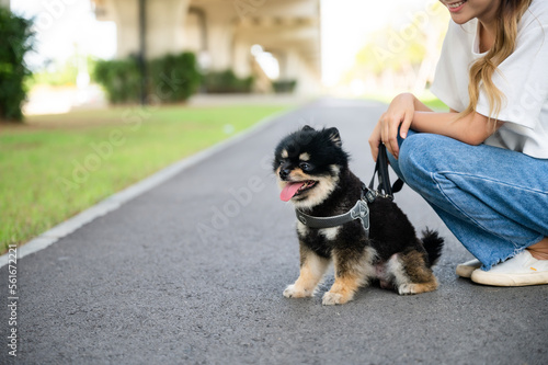 Happy young asian woman playing and sitting on road in the park with her dog. Pet lover concept
