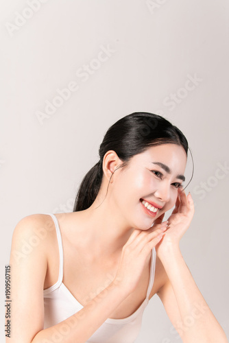 Happy young asian woman with healthy facial, body skin and natural glamour makeup for advertise skincare product, model marketing beauty clinic and cosmetics concept.
