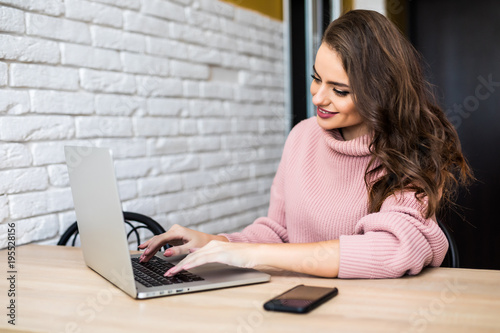 Happy Young Beautiful Woman Using Laptop, Indoors at home