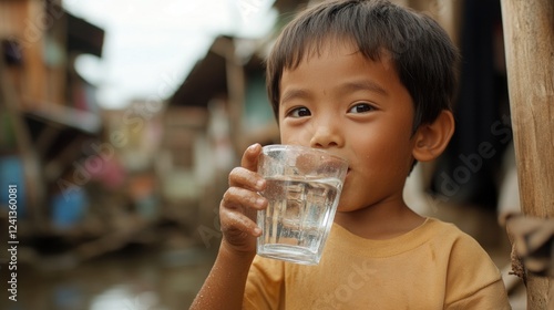 Happy young boy enjoying fresh clear drinking water in a glass while smiling outdoors near a community in a vibrant rural setting