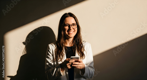 businesswoman, smartphone, smiling, sunlight, office, shadow, light, technology, success, happy, young, woman, professional, modern, work, communication, innovation, connection, network, digital, marketing, business, career, corporate, entrepreneur, leader, management, teamwork, collaboration, strategy, growth, achievement, positive, confident, optimistic, style, fashion, lifestyle, portrait, indoor