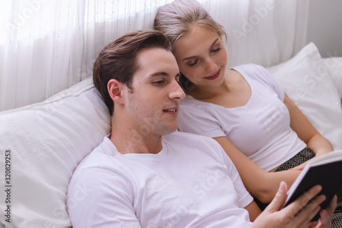 couple, happy, love, smile, valentine, romantic, young, human relationships, affection, bonding, together, family, man, marriage, married, wife, husband, woman, spouse, home, girl, boyfriend, dreamy, caucasian, tender, lover, read, book, moment, bedchamber, february 14, relax, joy, enjoy, rest, beautiful, photogenic, engaged, lifestyle, activity, indoor, leisure, romance, recreation, comfortable, carefree, loving, flirting, joyful, bed