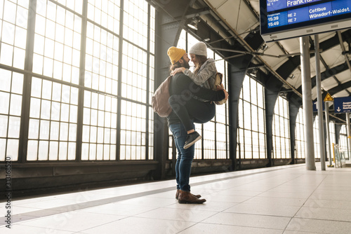 couple, people, man, woman, adult, young, holiday maker, backpack, glass pane, holding, smile, travelling, embracing, autumn, excitement, cheerful, happiness, love, close, standing, energy, style, lifestyle, mobility, affection, arrival, write, urban, bonding, travel, capital, sunshine, sunlight, beam of light, sunbeam, backlit, day, laughing, carrying, look, affectionate, urban scene, casual attire, exuberance, platform