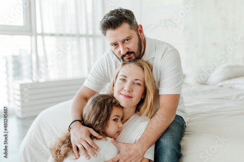Happy young family. Man, woman and daughter. Light background, studio shot. Interracial marriage, different nationalities