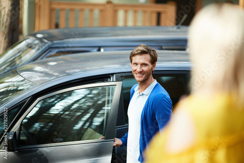 Happy young man in casualwear standing by car while going to leave for shopping in the city and looking at his wife