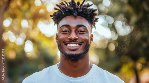 man, young, happy, smile, smiling, outdoors, nature, portrait, background, bokeh, tree, leaf, sunlight, sunshine, light, bright, cheerful, joyful, positive, carefree, relaxed, confident, photogenic, attractive, stylish, cool, casual attire, fashion, model, person, face, expression, teeth, hair, dreadlocks, black, african, american, skin, guy, male