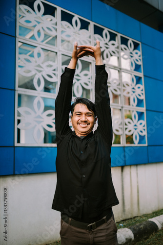man, stretching, building, facades, happy, young, urban, outdoors, exercise, relaxation, smile, asian, casual attire, shirt, arm, up, person, wellness, lifestyle, positive, energy, activity, architecture, modern, design, blue, wall, pattern, window, healthy, cheerful, enjoyment, carefree, confident, success, achievement, reaching, inspiration, determination, aspiration, motivation, ambition, progress, growth