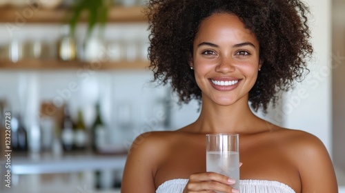 happy, woman, kitchen, morning, supplement, vitamin, water, health, lifestyle, nourishment, wellness, model, smiling, curly hair, home, treatment, glasses, cheerful, adult, young adult, natural light, glowing, energy, routine, hydratation, femininity, balance, positive, beauty, vitality, joy, healthy eating, fresh, organic, focused, mindful, habit, empowerment, well-being, dietitian