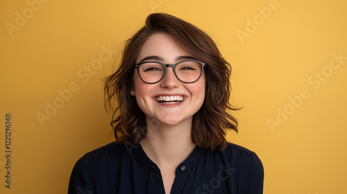 Happy young woman with glasses smiling against a yellow background