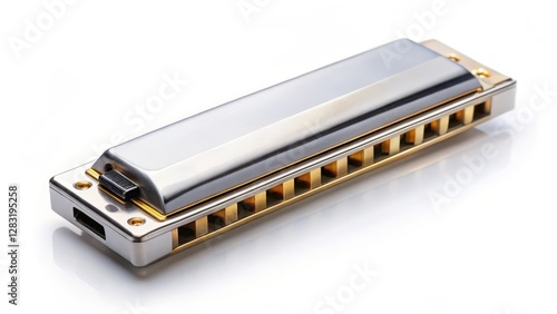 harmonica, musical, instrument, music, metal, chrome, silver, gold, hole, reed, key, blues, folk, isolated, white, background, studio, object, photo, product, shot, image, closeup, detail, texture, shiny, bright, instrumentation, sound, melody, harmony, tone, playback, wind, air, reed, chromatic