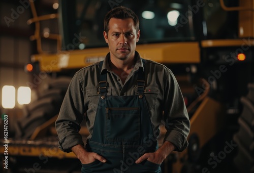 mechanic, harvester, merging, cutting, height, setting, barn, agriculture, machinery, maintenance, men at work, farm, equipment, rural, industry, technician, tool, labor, dedication, farming, crop, harvest, tractor, professional, skill, service, repair, operation, technology, environment, safety, precision, sharpened, hand, expertise, male, man, clothing, overall, serious, portrait, indoor